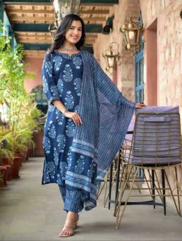 Floral Printed Notch Neck Thread Work Straight Kurta With Trousers & Dupatta