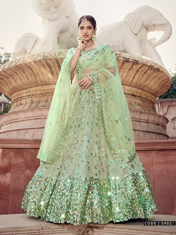 FUSIONIC Pastel Green Color Soft Net Base Sequins Work Lehenga Choli For Women, Semi Stitched